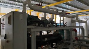 The system is equipped with three Ammonia Bitzer screw compressors and cools glycol at -6˚C for the cold rooms coolers, production area and falling film chiller which produce cold water from +28˚C to 0,5˚C for the vegetable washers.